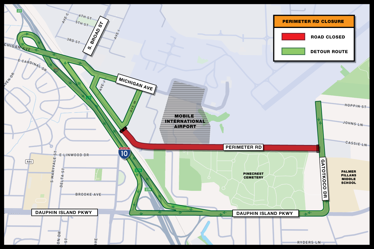 MOBILE, Ala. (January 9, 2025) – Beginning Monday, January 20, Perimeter Road at the Brookley Aeroplex will close for approximately 3-weeks while the Mobile Airport Authority widens the roadway and installs new utilities near the entrance to the new Mobile International Airport (BFM) Terminal and parking garage.